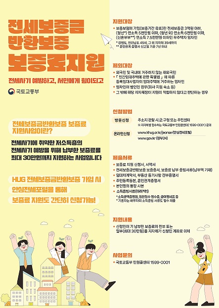 전세보증금반환보증 보증료 지원은 전세 계약기간 종료 후에도 전세보증금을 돌려받지 못하는 임차인의 피해를 막기 위해 마련된 제도로, 주택도시보증공사(HUG), 한국주택금융공사(HF), 서울보증보험(SGI) 등에서 제공하는 보증상품의 보증료를 최대 30만원까지 지원한다.