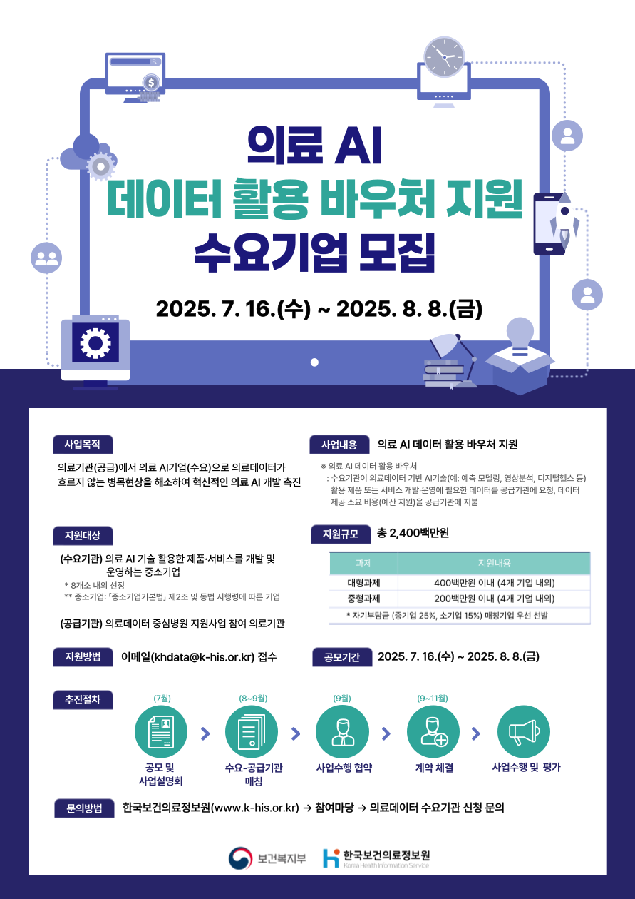 보건복지부(장관 조규홍)와 한국보건의료정보원(원장 염민섭)은 안전한 의료데이터 활용 촉진을 위해 7월 16일(수)부터 8월 8일(금)까지「의료 AI 데이터 활용 바우처 지원사업」 수요기업을 공모한다고 밝혔다.
